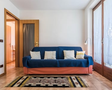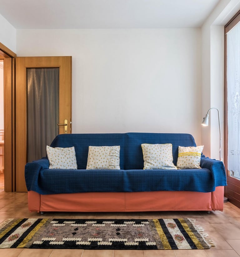 Un accogliente soggiorno con divano-letto matrimoniale, che offre ulteriori posti letto e uno spazio confortevole per rilassarsi in compagnia.